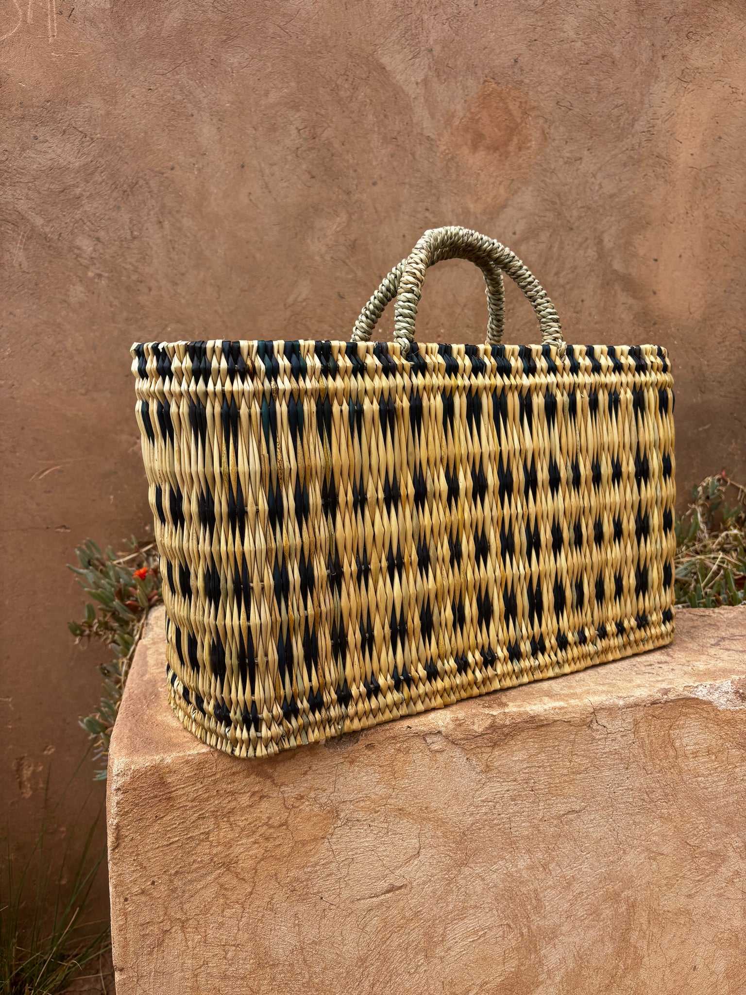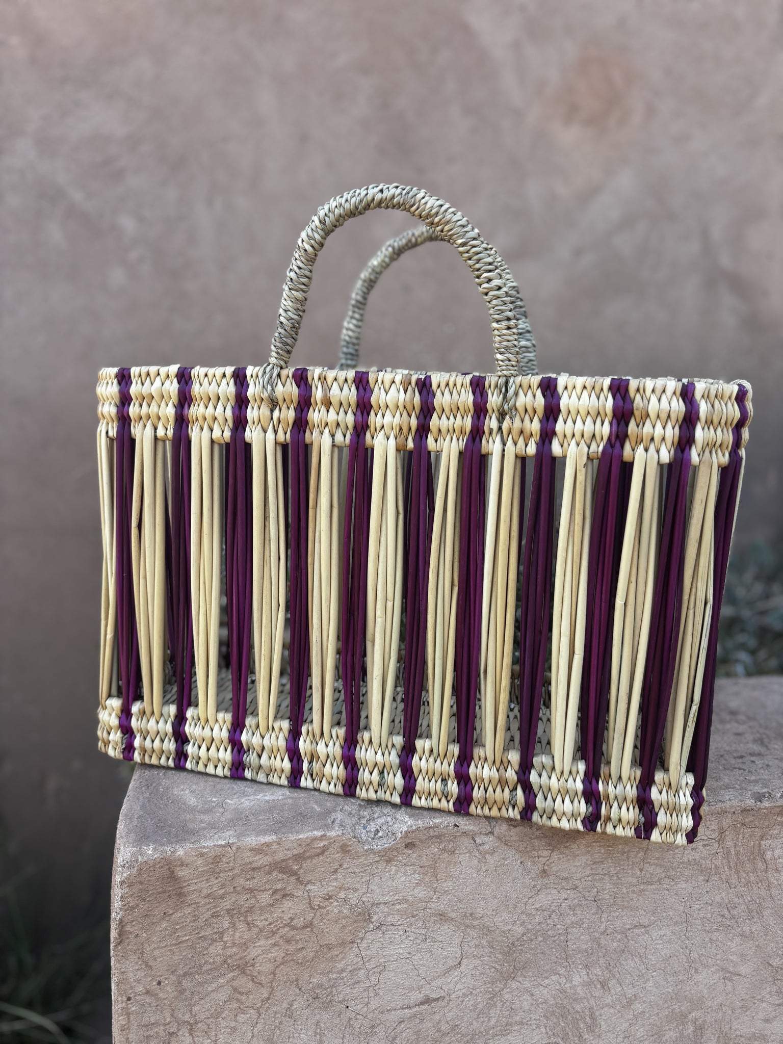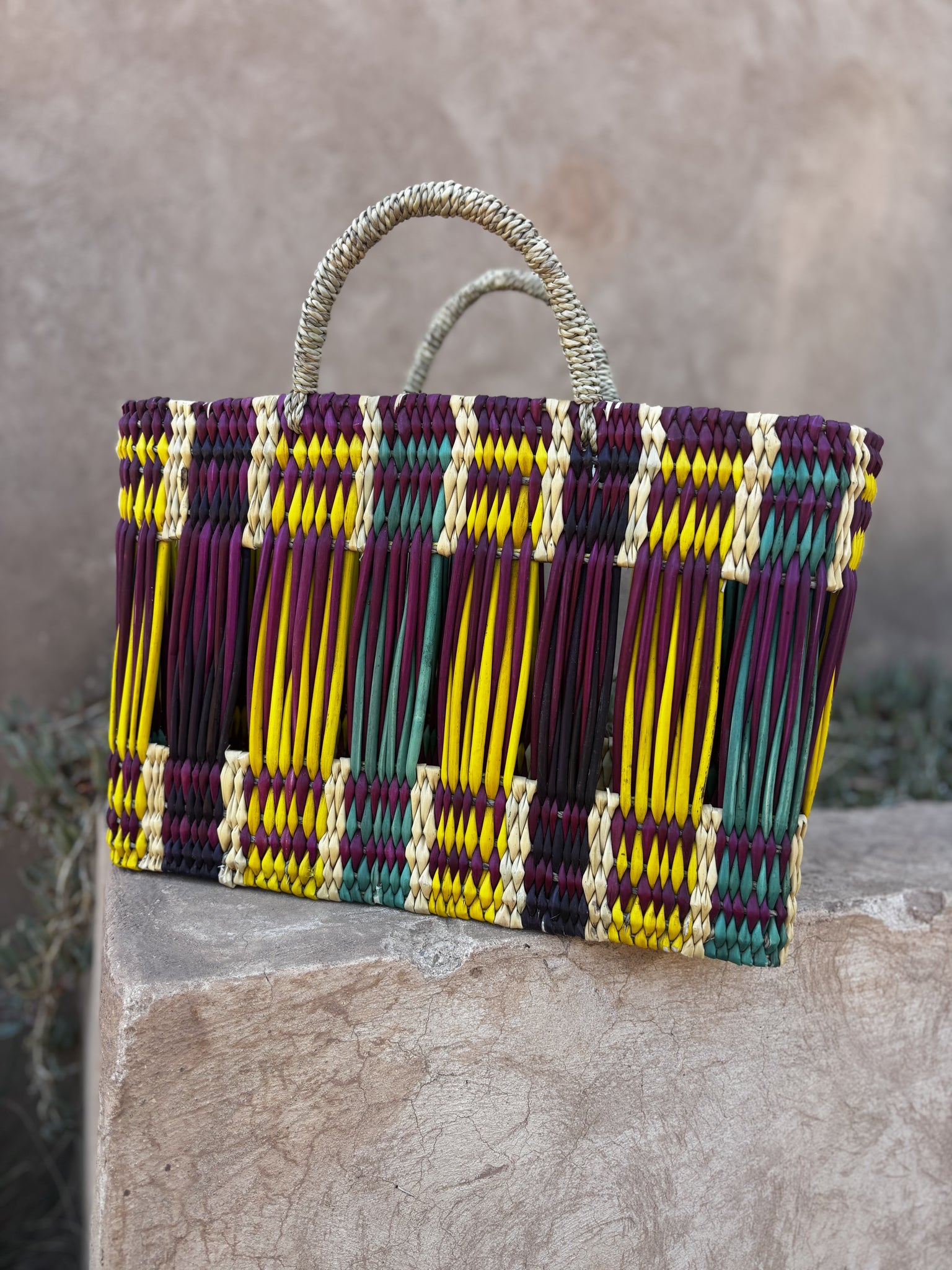 Experience the charm of our handmade Moroccan wicker bags, expertly crafted by skilled artisans. These rectangular bags feature a variety of vibrant, colorful patterns, adding a touch of elegance to any outfit.
